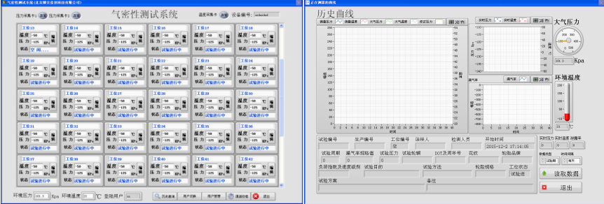 本系统符合 ASTM F1112-06a 的要求,,,,主要用于实验室对轮胎进行漏气率的检测。。。。通过压力变送器及专用接头对轮胎的充气压力及温度进行长时间的测量,,,,将数据采集并传送到上位计算机进行数据处理、、、 分析,,,,从而得出轮胎的漏气率。。。经系统软件处理后形成直观的数据显示界面,,,用户可实时、、快速、、、精准的掌握当前的测试状态,,,并根据检测状态进行动态调整。。